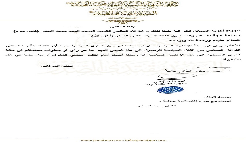 وفي جواب لمقتدى الصدر على سؤال لأحد اتباعه، حول اندفاع الكتل لطرح فكرة الأغلبية السياسية، اليوم (22 آذار 2018)، قال إنه "ليس مع هذه الفكرة حاليا".