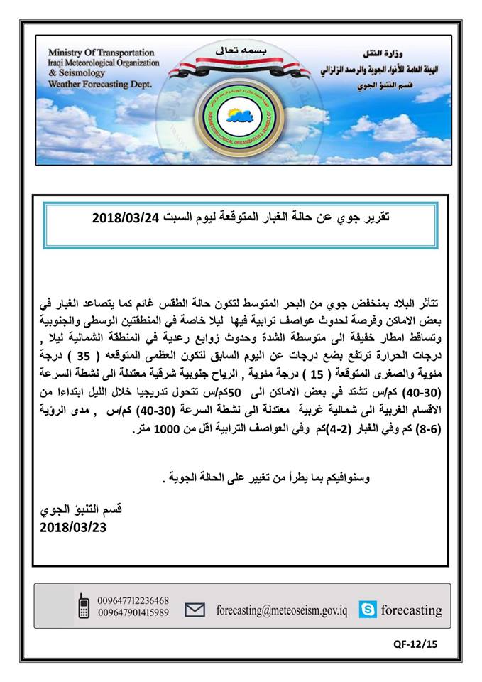 وذكر تقرير للهيئة، ان "البلاد تتأثر غداً بمنخفض جوية من البحر المتوسط لتكون حالة الطقس غائما كما يتصاعد الغبار في بعض الأماكن وفرصة لحدوث عواصف ترابية فيها ليلاً خاصة في المنطقتين الوسطى والجنوبية وتساقط أمطار خفيفة الى متوسطة الشدة وحدوث زوابع رعدية في المنطقة الشمالية ليلاً".