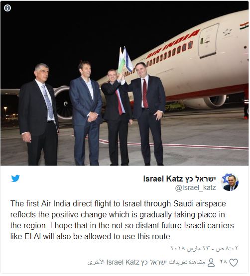 وكانت طائرة “طيران الهند” هبطت مساء الخميس في مطار “بن غوريون”، في أول رحلة مباشرة إلى فلسطين المحتلة عبر الأجواء السعودية.