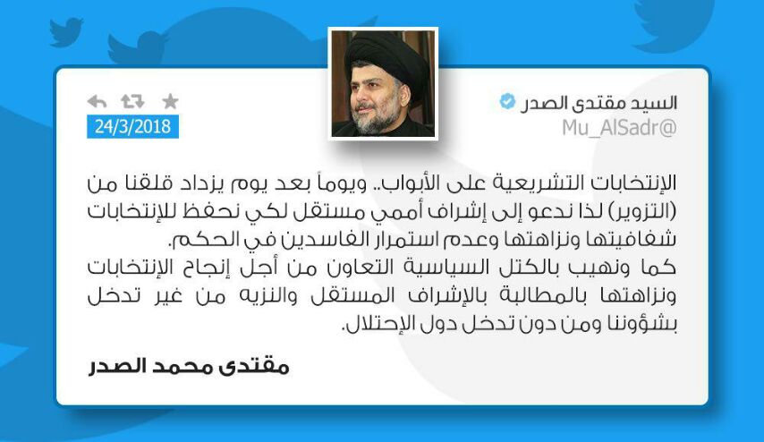 وقال السيد مقتدى الصدر في تغريدة على صفحة التواصل الاجتماعي {تويتر}، اليوم ان" الانتخابات التشريعية على الأبواب، ويوما بعد يوم يزداد قلقنا من التزوير لذا ندعو الى اشراف اممي مستقل؛ لكي نحفظ للانتخابات شفافيتها ونزاهتها وعدم استمرار الفاسدين في الحكم".