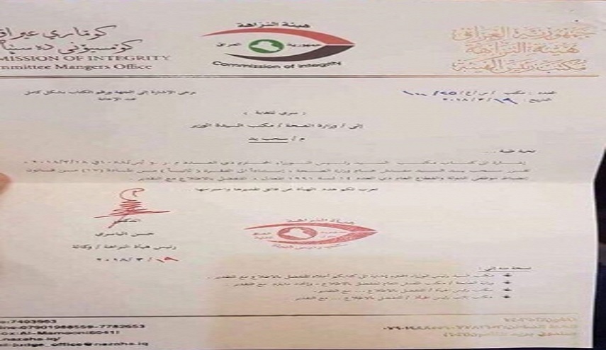 وذكر كتاب صادر من النزاهة الى وزارة الصحة "اشارة الى كتاب مكتب رئيس الوزراء، تقرر سحب يد مفتش عام وزارة الصحة، لإستناداً الى الفقرة {ثانياً} من المادة 17 من قانون انضابط موظفي الدولة والقطاع العام ذي العدد 14 لسنة 1991 المعدل"