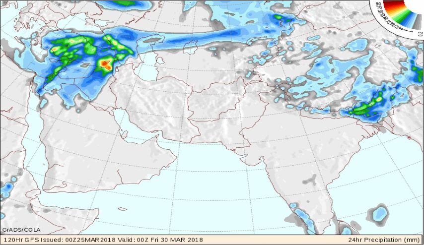 وذكرت منظومة أرصاد العراق في صفحتها على موقع التواصل الاجتماعي الـ"فيسبوك" اليوم 27 آذار 2018 أنه وحسب توقعات الموديل الاميركي هناك تراكم للامطار بحلول نهاية الاسبوع.