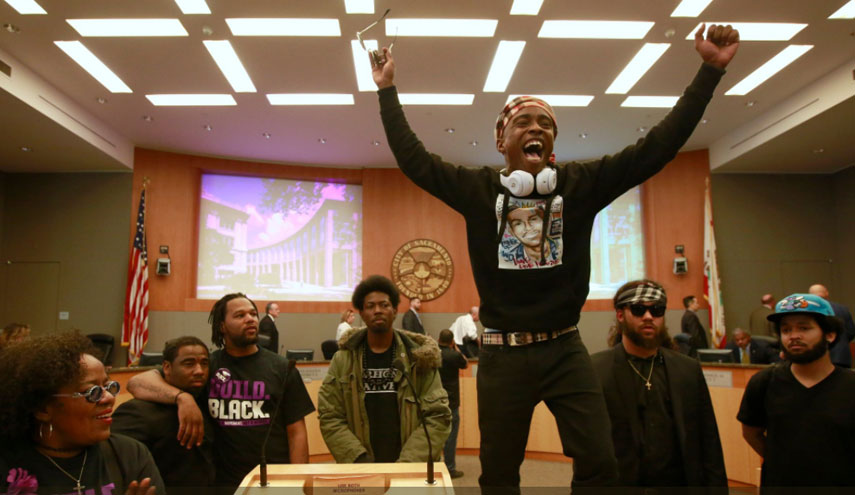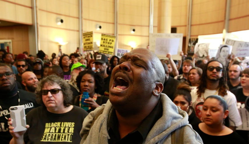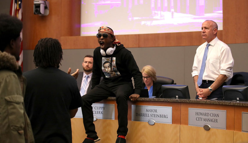 وقطع ستيفانت كلارك، شقيق الضحية ستيفن (22 عاما)، برفقة عدد من المُحتجين، اجتماع مجلس بلدية المدينة، وخاطب أعضاء المجلس قائلا: "أصَبتمونا بخيبة أمل".