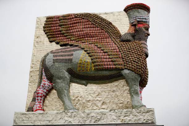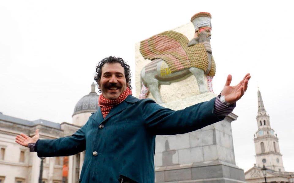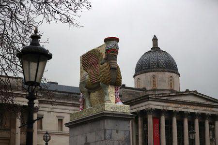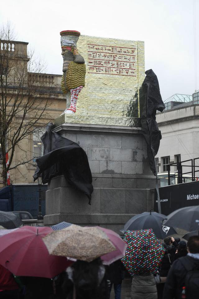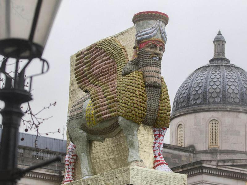 من جهتها ذكرت "رويترز" أنه تم عرض تمثال الثور المجنح الآشوري القديم الذي دمره مقاتلو "داعش" في عام 2015 ثم أعيد صياغته في تغليف المواد الغذائية المعاد تدويره في الشرق الأوسط في ميدان ترافلجار في لندن.