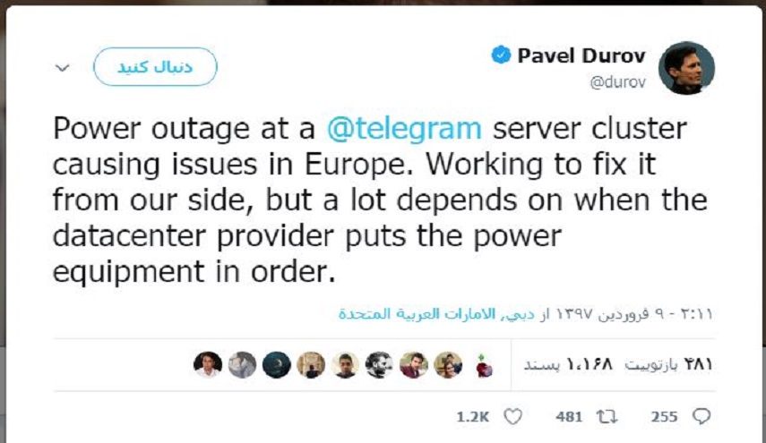 وعلق مؤسس التطبيق، بافل دوروف، عبر حسابه على تويتر قائلا إن هناك عطلا في أحد مخدمات البرنامج، ويتم العمل على حله.