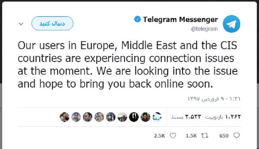 واعلنت شركة تلغرام انقطاع خدمات التطبيق عن اوروبا وشرق الاوسط ودول رابطة الدول المستقلة CIS.