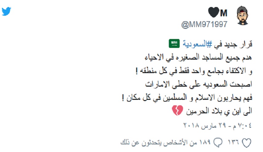وتأتي هذه الإزالة بحسب ما ذكره الناشطون تنفيذا لقرار بإزالة جميع المساجد الصغيرة في السعودية والاكتفاء بمسجد واحد في كل منطقة.
