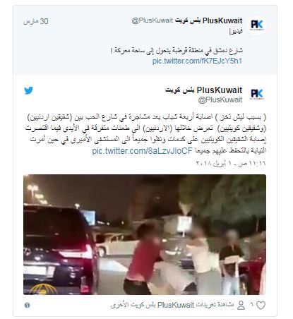 وذكر حساب “بلس الكويت” على “تويتر”، أن الشجار اندلع بين شقيقين أردنيين، وآخريْن كويتيين، تعرض خلاله “الاردنيين” الى طعنات متفرقة في الأيدي فيما اقتصرت إصابة الشقيقين الكويتيين على كدمات.