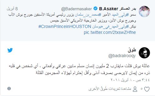 وأعرب السعودي حرب الحربي، عن استغرابه من زيارة عائلة بوش، متسائلا: "مو هذا الرئيس النجس اللي احتل العراق وقال إنها حرب صليبية وقتل مليون ونصف عراقي!؟".