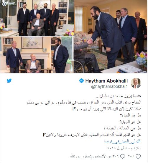 وكتب الإعلامي والناشط الحقوقي المصري، هيثم أبو خليل على حسابه في "تويتر": "عندما يزور محمد بن سلمان السفاح بوش الأب الذي دمر العراق وتسبب في قتل مليون عراقي عربي مسلم فماذا تكون إذن الرسالة التي يريد أن يوصلها؟".