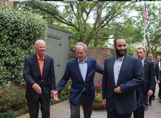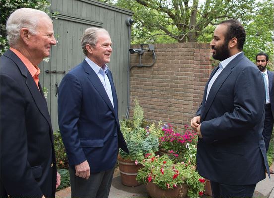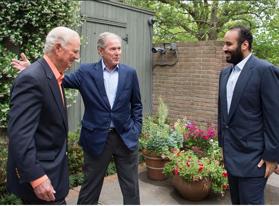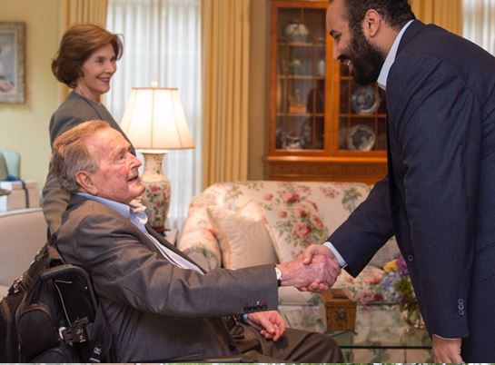 وبثت وسائل إعلام سعودية، صورا لولي العهد السعودي أثناء زيارته إلى بيت جورج بوش الأب، بحضور ابنه جورج بوش الذي غزا العراق في عام 2003، وأعلن احتلاله وإسقاط نظام صدام حسين.