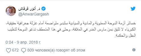 وقال قرقاش إن قطر عليها أن تعود إلى جذور الأزمة وشدد على أن "سنوات التآمر والغدر والطعن في الظهر لا يمكن مسحها بجرة قلم"، وتابع: "والآن وقد غدت الخيارات واضحة في جديتها آن الأوان لتترك الدوحة ارتباكها وأن تقرأ بتمعن مبادئ الحل ومطالب الدول الأربع".