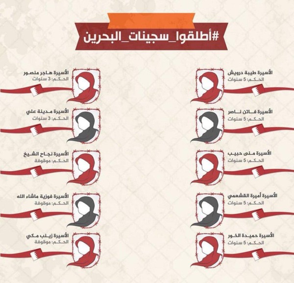 وتعتقل البحرين حاليا 10 نساء على الأقل في قضايا سياسية، فيما صدر بحق 3 شقيقات أحكام بالسجن 3 أعوام من محكمة أول درجة، مع وقف التنفيذ.