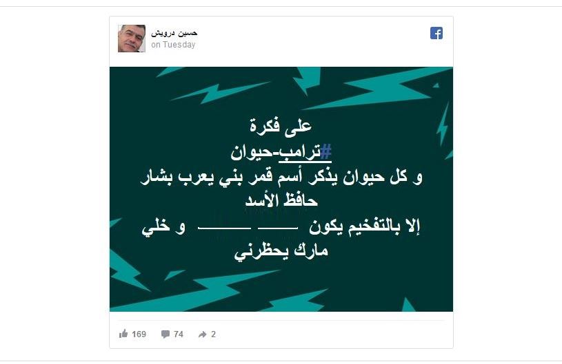 ونشر أحدهم على صفحته في "فيسبوك" منشورا ذكر فيه ما يشبه أحد الأمثال الشعبية السورية "قال رضينا بالضربة والضربة ما رضيت فينا!!!" والمقصود فيها الضربة الأمريكية المتوقعة.