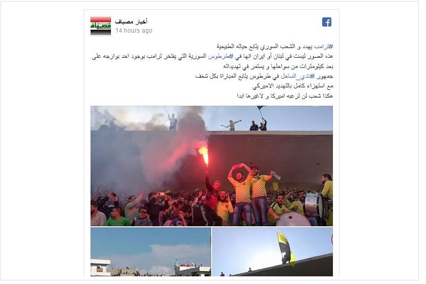 وأظهرت إحدى صفحات "فيسبوك" "أخبار مصياف" منشورا بعنوان "ترامب يهدد والشعب السوري يتابع حياته الطبيعية"، وتضمن المنشور صورا من مدينة طرطوس "التي يفتخر ترامب بوجود إحدى بوارجه على بعد كيلومترات من سواحلها ويستمر في تهديداته" بحسب ما ذكرته الصفحة. حيث كان جمهور نادي الساحل في طرطوس يتابع المباراة بكل شغف على أرض الملعب…واصفين أنهم في حالة استهزاء كامل بالتهديد الأمريكي… وقالت: "هكذا شعب لن ترعبه أمريكا ولا غيرها أبدا".