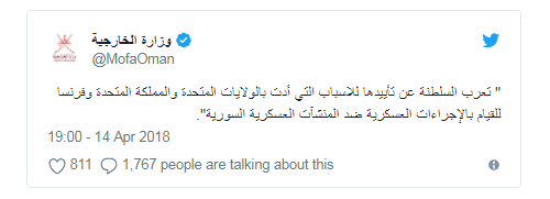 وفي تغريدة عبر الحساب الرسمي للوزارة على "تويتر"، قالت مسقط إن "السلطنة تعرب عن تأييدها للأسباب التي أدت بالولايات المتحدة والمملكة المتحدة وفرنسا للقيام بالإجراءات العسكرية ضد المنشآت العسكرية السورية"، دون ان تعلن تأييدها للضربة التي إدعت أميركا أنها بسبب استخدام المواد الكيماوية في الغوطة الشرقية.