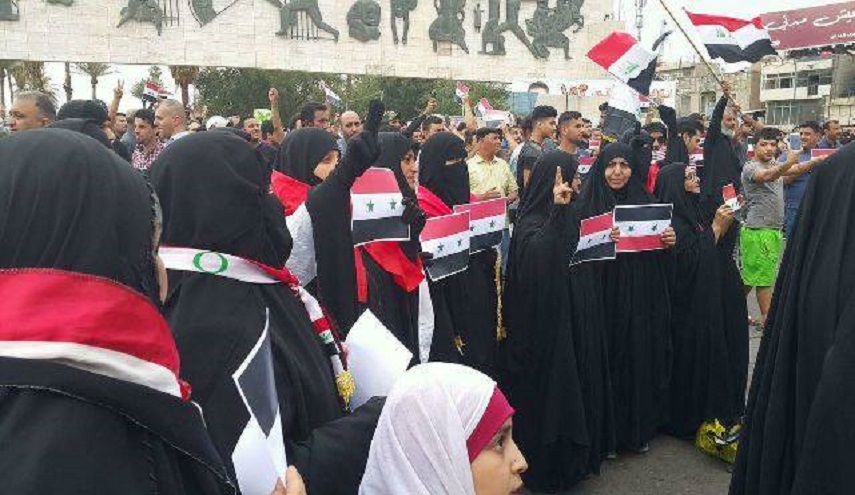 وأضاف المراسل، أن المتظاهرين رفعوا الاعلام العراقية والسورية دلالة على تضامنهم مع الشعب السوري، فيما هتفوا هتافات بالضد من الولايات المتحدة وحلفائها.