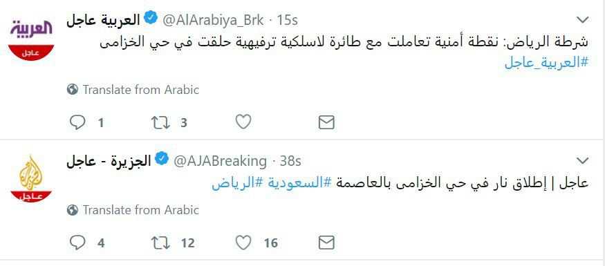 واعترفت قناة العربية باطلاق النار بالقرب من القصور الملكية في الرياض زاعمة نقلا عن شرطة الرياض ان نقطة أمنية سعودية تعاملت مع طائرة لاسلكية حلقت في حي الخزامي.