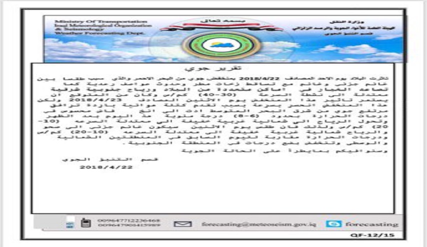 بحسب الهيئة فأن "طقس اليوم سيكون غائم جزئي الى صحو، فيما ستكون درجات الحرارة مقاربة لليوم السابق في المنطقتين الشمالية والوسطى، وتنخفض بضع درجات في المنطقة الجنوبية".
