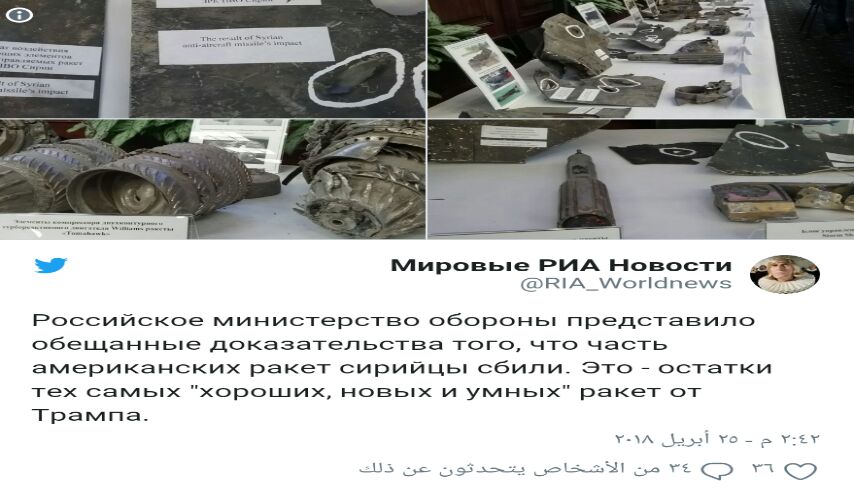 ويذكر أن الولايات المتحدة الأمريكية وفرنسا وبريطانيا شنت، يوم 14 نيسان/أبريل الماضي، هجوما صاروخيا ضد سوريا، ردا على هجوم كيميائي مزعوم في مدينة دوما بالغوطة الشرقية.