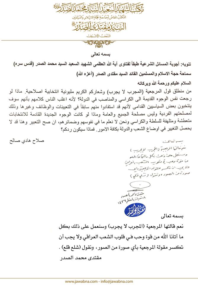 وأوضح الصدر، في رد على سؤال من احد أتباعه، اليوم (25 نيسان 2018)، بأنه مع مقولة المرجعية "المجرب لا يجرب"، وأضاف "سنعمل على ذلك بكل ما آتانا الله من قوة وحب لدى الشعب العراقي ولا يجب أن تُكسر مقولة المرجعية بأي صورة من الصور ونقول شلع قلع."