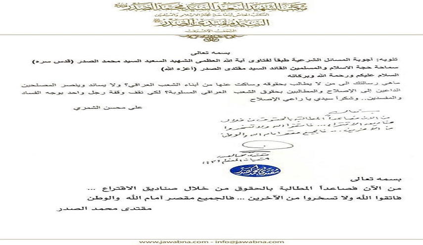 وقال الصدر، ردا على سؤال حول المتظاهرين من أبناء الحشد الشعبي المطالبين بحقوقهم، اليوم (26 نيسان 2018)، "هل أخذ المقاومون استحقاقهم ليأخذ المجاهدون استحقاقهم؟ المهم سنرسل وفدا للاطلاع على تلك المشاكل".