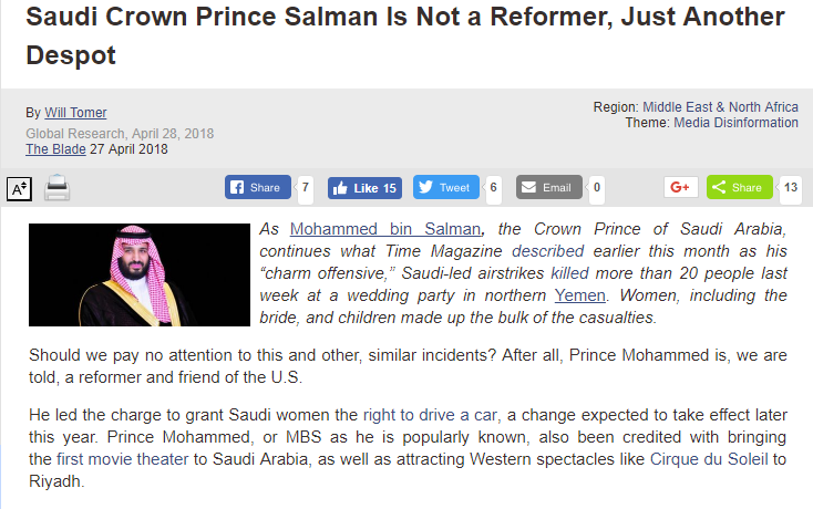 قال الموقع الكندي: يجب أن نولي اهتماماً لهذه الحوادث وغيرها، وتابع: "وبعد كل هذا، يُقال لنا إن الأمير محمد، مصلح وصديق لأمريكا".
