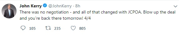 وتعليقا على سياسات ترامب من الاتفاق النووي قال كيري: اخرجوا من الاتفاق النووي حتى يبدأ كل شيء من جديد ونرجع الى الوراء.