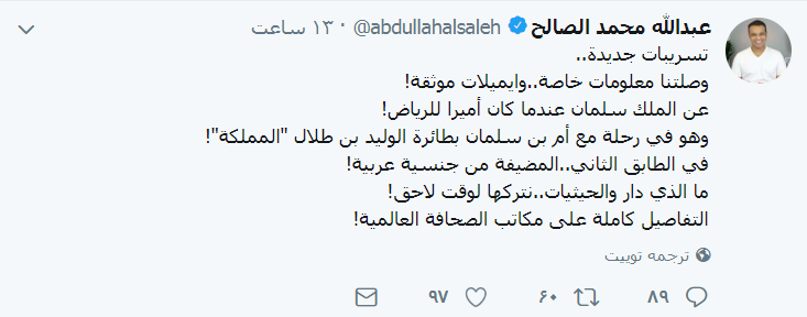 وتابع ملمحا لتفاصيل التسريب دون ذكر أحداثه: ”وهو في رحلة مع أم بن سلمان بطائرة الوليد بن طلال “المملكة”! في الطابق الثاني..المضيفة من جنسية عربية ما الذي دار والحيثيات..نتركها لوقت لاحق التفاصيل كاملة على مكاتب الصحافة العالمية”.
