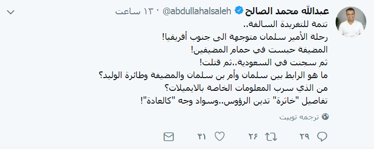 وأضاف “ما هو الرابط بين سلمان وأم بن سلمان والمضيفة وطائرة الوليد؟من الذي سرب المعلومات الخاصة بالايميلات؟ تفاصيل “خاثرة” تدين الرؤوس..وسواد وجه “كالعادة" بحسب الصالح.