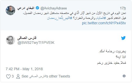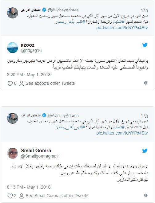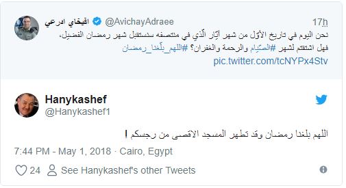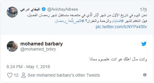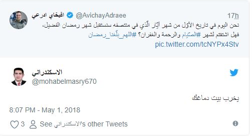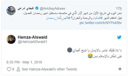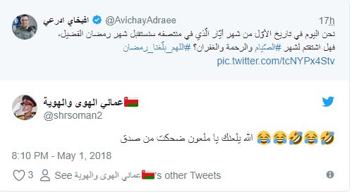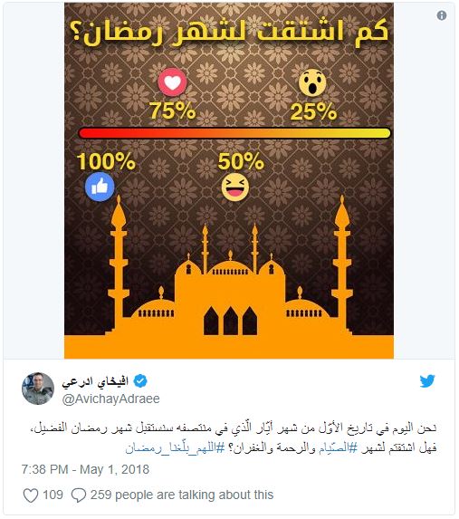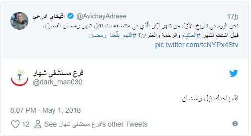 ودون “أدرعي” في تغريدة له عبر حسابه الرسمي بتويتر ما نصه:”نحن اليوم في تاريخ الأوّل من شهر أيّار/ مايو الّذي في منتصفه سنستقبل شهر رمضان الفضيل”!!