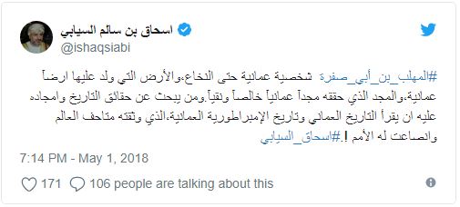 وأكد نائب رئيس مجلس الشورى العماني إسحاق سالم السيابي، على تصريحات مفتي مصر السابق بقوله، إن #المهلب_بن_أبي_صفرة شخصية عمانية حتى النخاع، والأرض التي ولد عليها ارضآ عمانية،والمجد الذي حققه مجدآ عمانيآ خالصآ ونقيآ.”