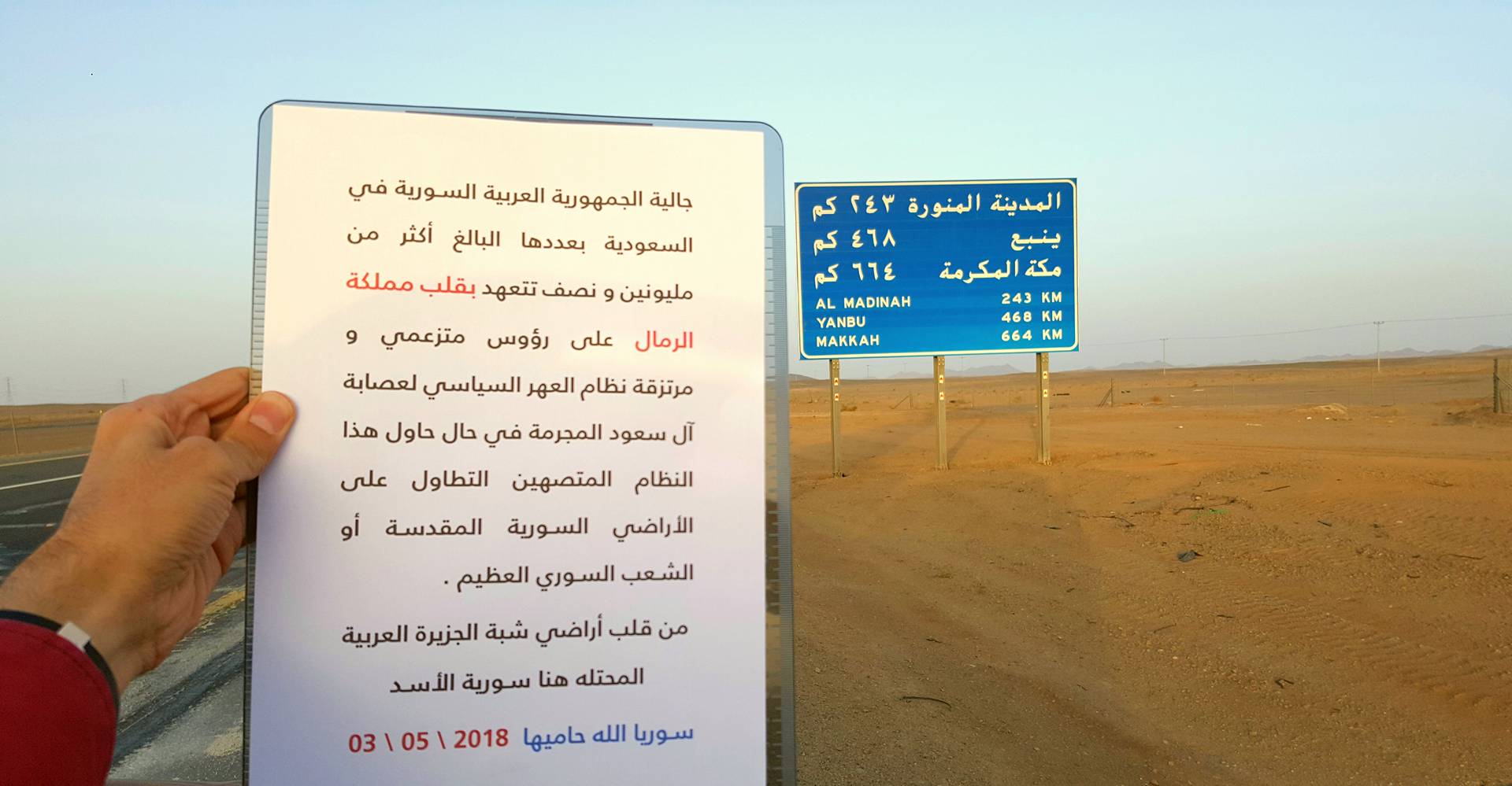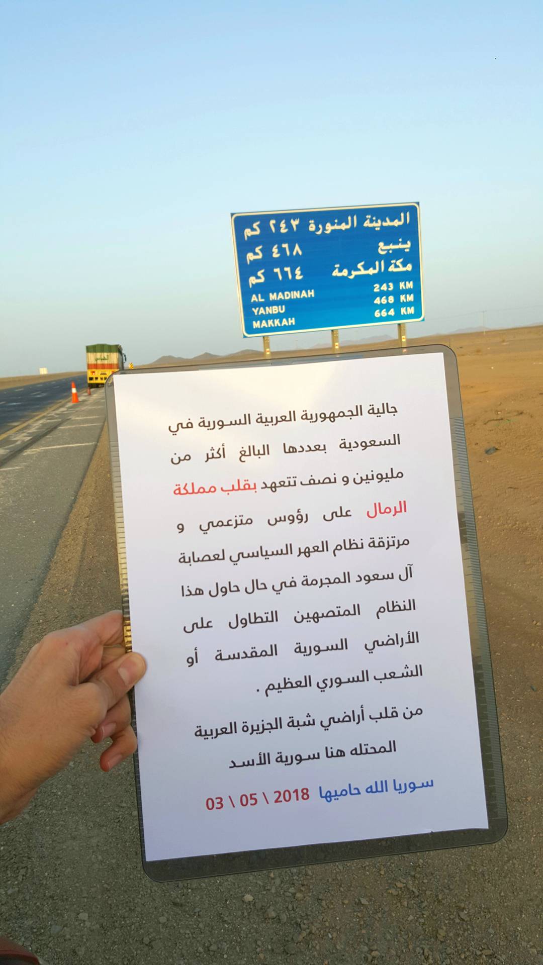 وجاء في الرسالة، التي التقطت من احد شوارع السعودية، ان الجالية السورية في السعودية "تتعهد بقلب مملكة الرمال على رؤوس متزعمي ومرتزقة نظام العهر السياسي لعصابة آل سعود المجرمة في حال حاول هذا النظام المتصهين التطاول على الاراضي السورية..".