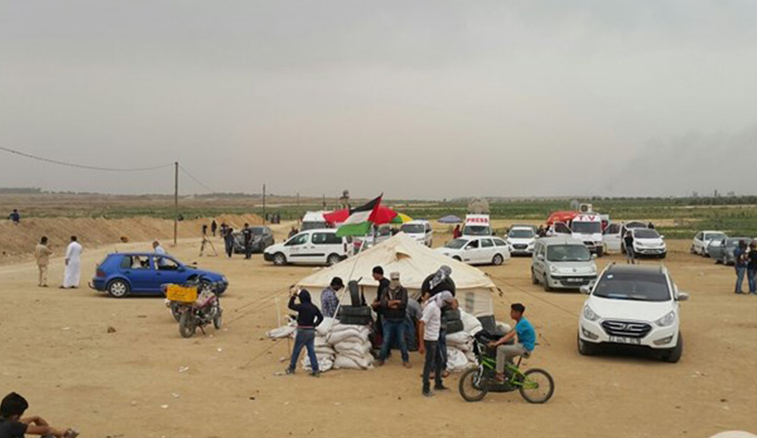 ونقلت مصادر طبية اصابة مواطن بالرصاص الحي في البطن شرق خان يونس حيث بدأت الجماهير بالتوافد الى المخيمات الخمسة.