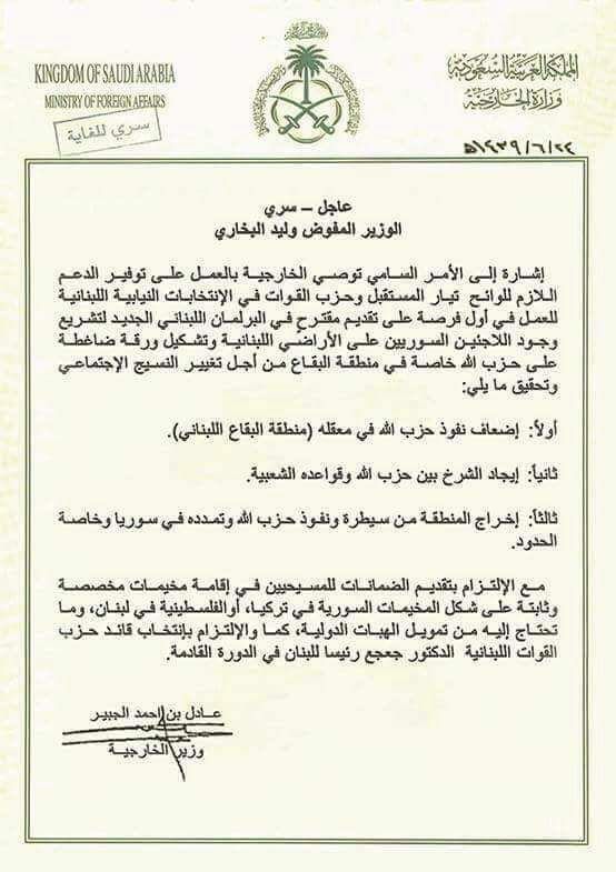 بالصورة: وثيقة سرية تظهر التدخل السعودي في انتخابات لبنان ضد حزب الله