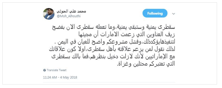 لذلك نقول لمن يزعم علاقته بأهل سقطرى، أولا كون علاقاتك مع الإماراتيين لأنك لازلت دخيلا بنظرهم، فما بالك بسقطرى التي تعتبركم محتلين وغزاة".
