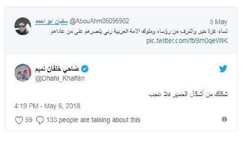 ليهاجمه “خلفان” بشدة ويكشف عن الغل والحقد بداخله تجاه الفلسطينيين بقوله:"شكلك من أشكال الحمير فلا عجب"