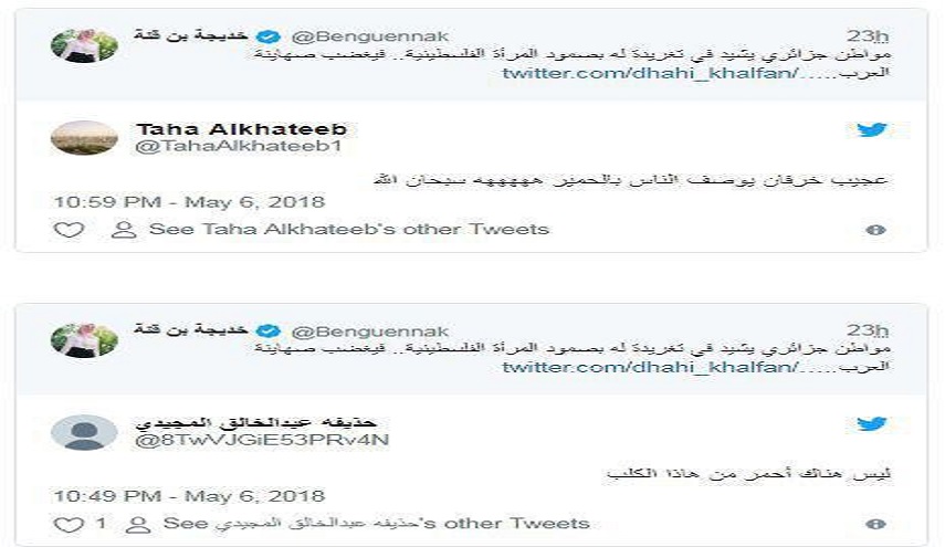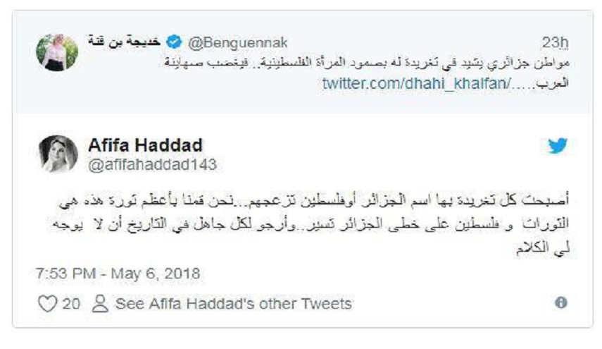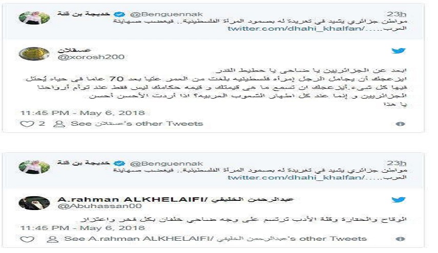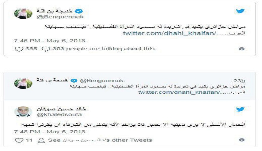 ودون المواطن الجزائري "سفيان ابو احمد" معلقا على الصورة التي أرفقها بتغريدة على حسابه بتويتر رصدتها (وطن) ما نصه:"نساء غزة خير واشرف من رؤساء وملوك الامة العربية ربي ينصرهم على من عاداهم".