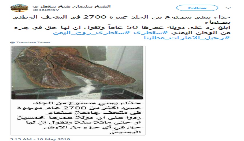 وكتب «شلولها»، في تغريدة عبر «تويتر»، مرفقا بها صورة الحذاء الموجود في المتحف اليمني، والذي تمت صناعته على يد أحد الحرفين في «سقطرى»، قائلا: «حذاء يمني مصنوع من الجلد عمره 2700 في المتحف الوطني بصنعاء أبلغ رد على دويلة (الإمارات) عمرها 50 عاماً، وتقول إن لها حق في جزء من الوطن اليمني».