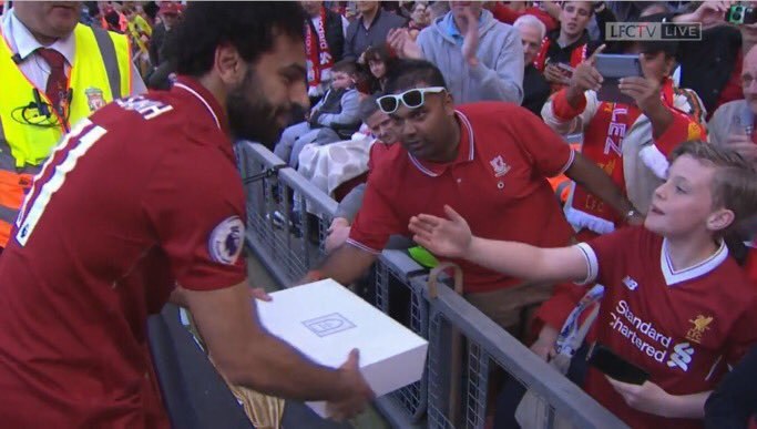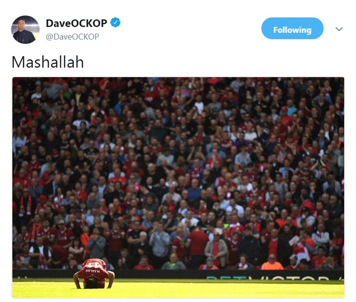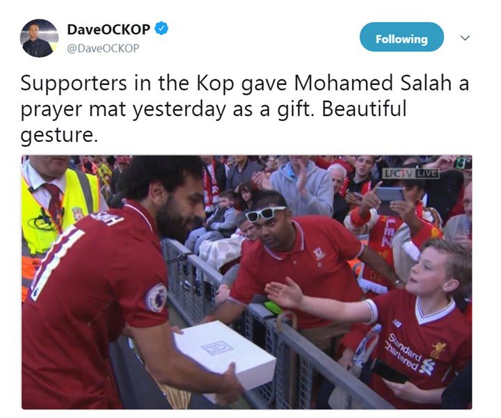 وكتب ديفيد أكوب تغريدة على تويتر "الداعمون في ملعب أنفيلد يهدون محمد صلاح «سجادة صلاة» أمس، إشارة جميلة"، وعلق كوب على صورة لسجود محمد صلاح في ملعب أنفيلد بتغريدة "ماشالله". يذكر أن محمد صلاح، لاعب ليفربول توج، أمس الأحد، بلقب هداف الدوري الإنجليزي الممتاز موسم 2017-2018. وكانت مباريات الجولة الـ 38 والأخيرة من الدوري الإنجليزي "بريميرليج" شهدت تسجيل صلاح لهدف عزز به صدارته لهدافي الدوري بـ 32 هدفًا، وبفارق هدفين عن ملاحقه هاري كين مهاجم توتنهام.