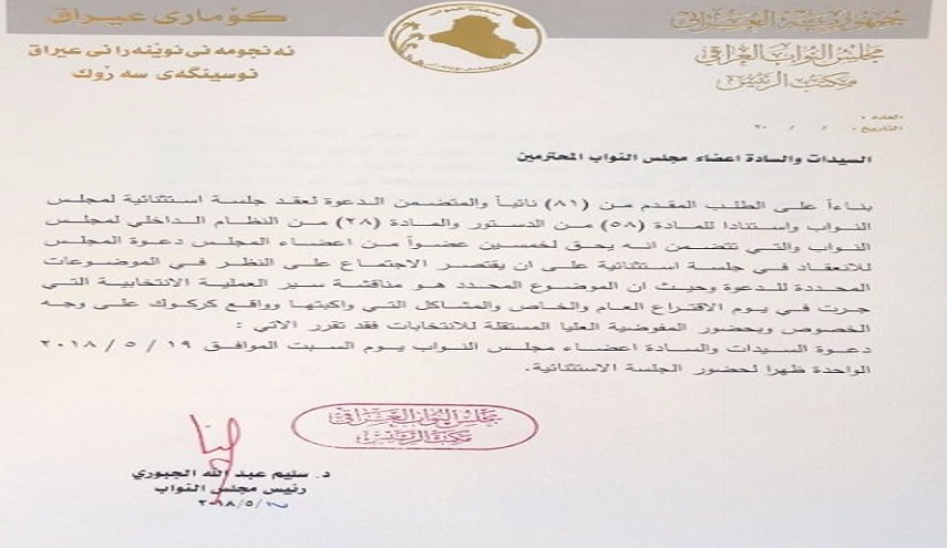 بالوثيقة.. تحديد السبت المقبل موعدا لعقد جلسة طارئة للبرلمان العراقي