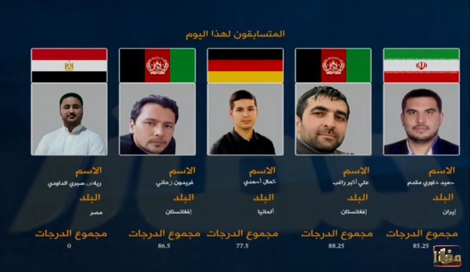 مفازا - الكوثر: إعلان درجات القراء المتسابقين في اليوم الثالث من مرحلة التصفيات للدورة 11 من مسابقة إن للمتقين مفازا على قناة الكوثر الفضائية وحصل القارئ الأفغاني على اكبر راغب على اعلى الدرجات في هذا اليوم.
