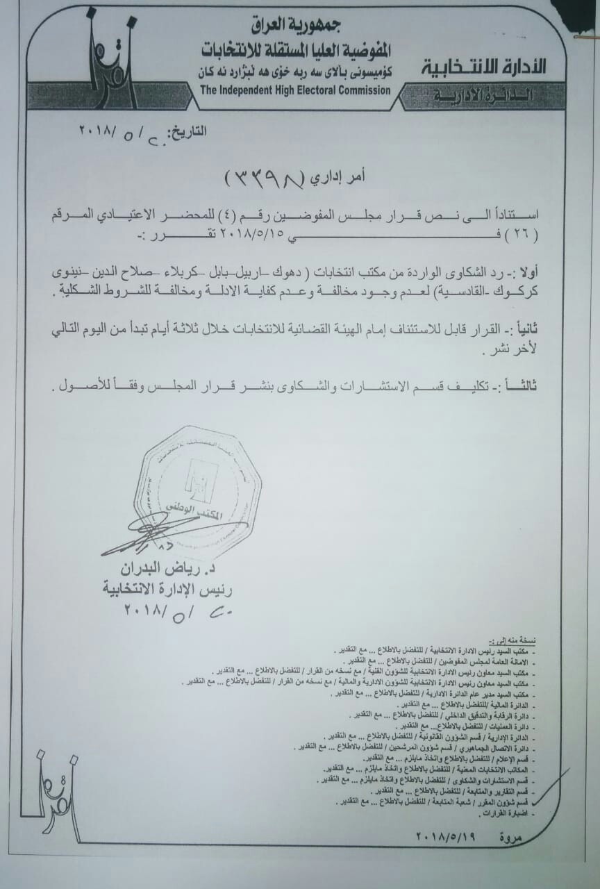 وقال الصالحي، ان "مجلس المفوضية اصدر قرارا برفض شكاوى ٨ محافظات وهي دهوك واربيل بابل وكربلاء وصلاح الدين ونينوى وكركوك والقادسية، وان على المتضرر اللجوء الى القضاء بعد ثلاث ايام من النشر"، معتبراً ان "المفوضية تصب الزيت على النار وتمهد بإثارة النعرة القومية والطائفية من خلال عدم اهتمامه بمطاليب الكتل السياسية في فتح الصناديق المشبوهة ومطاليب المتظاهرين في العد والفرز اليدوي بكركوك" حسب قوله.
