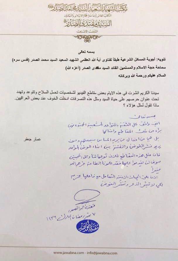 وعلق الصدر، في رد على سؤال من أحد اتباعه بشأن انتشار بعض مقاطع الفيديو لشخصيات تحمل السلاح وتتوعد وتهدد الناس بذريعة الحرص على حياته ومثل هذه التصرفات ادخلت الخوف عند بعض العراقيين، انه "واثق كل الثقة بالقواعد الشعبية المحبة، فهي براء من تلك المقاطع وأمثالها، بل هي من افعال من يريد المساس بسمعتهم ومن يريد نشر الفوضى والفتنة بين أبناء الوطن الواحد".