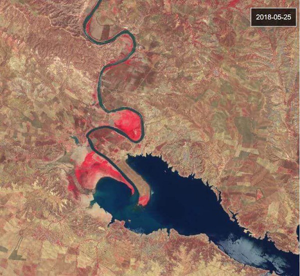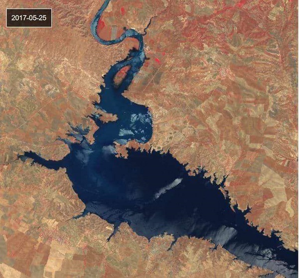 واوضح الجنابي ان" الصور الأربعة ادناه تعرض بحيرة سد الموصل ، حيث الاولى لبحيرة السد في مثل هذا اليوم قبل عام، والثانية ليوم أمس " ،راجياً " ملاحظة الفرق الواضح بين الخزينين الذي يبلغ حوالي 3 مليار متر مكعب".