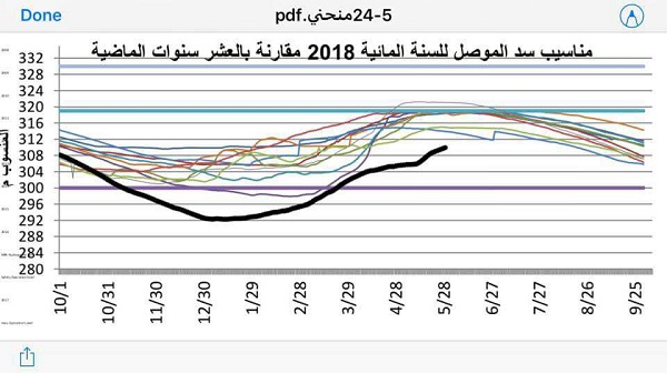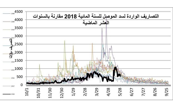 وبين ان " المنحنيات في الصورة الثالثة تعرض مناسيب سد الموصل خلال العشرة أعوام الماضية ابتداءً من اليوم الاول من الشهر العاشر من كل عام ولمدة 12 شهرا ، والخط الأسود السميك يمثل مناسيب البحيرة في عام 2018 ولحد هذا اليوم ، ومن الواضح ان مناسيب السد أوطأ من اي سنة سابقة ".