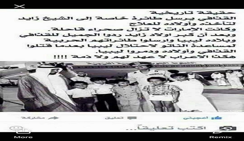 وبعد ان كبر اولاد زايد ردوا الجميل للقذافي وبلاده ليبيا وارسلوا طائراتهم الحربية لمساعدة الناتو لاحتلال ليبيا وبعد ما قتلوا القذافي واولاده ومروا ليبيا