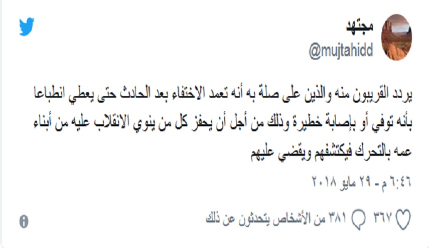 وأضاف في تدوينة أخرى:” يردد القريبون منه والذين على صلة به أنه تعمد الاختفاء بعد الحادث حتى يعطي انطباعا بأنه توفي أو بإصابة خطيرة وذلك من أجل أن يحفز كل من ينوي الانقلاب عليه من أبناء عمه بالتحرك فيكتشفهم ويقضي عليهم”.