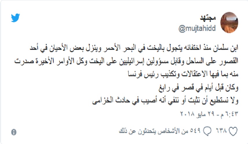 وقال “مجتهد” في تدوينات له عبر حسابه بموقع التدوين المصغر “تويتر” :” ابن سلمان منذ اختفائه يتجول باليخت في البحر الأحمر وينزل بعض الأحيان في أحد القصور على الساحل وقابل مسؤولين إسرائيليين على اليخت وكل الأوامر الأخيرة صدرت منه بما فيها الاعتقالات وتكذيب رئيس فرنسا وكان قبل أيام في قصر في رابغ ولا نستطيع أن نثبت أو ننفي أنه أصيب في حادث الخزامى”.