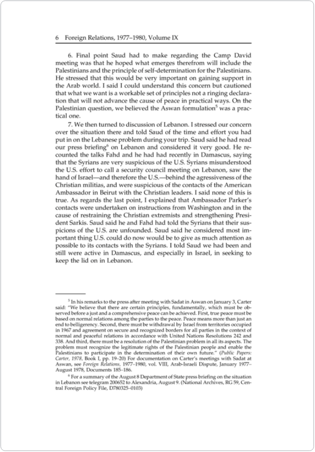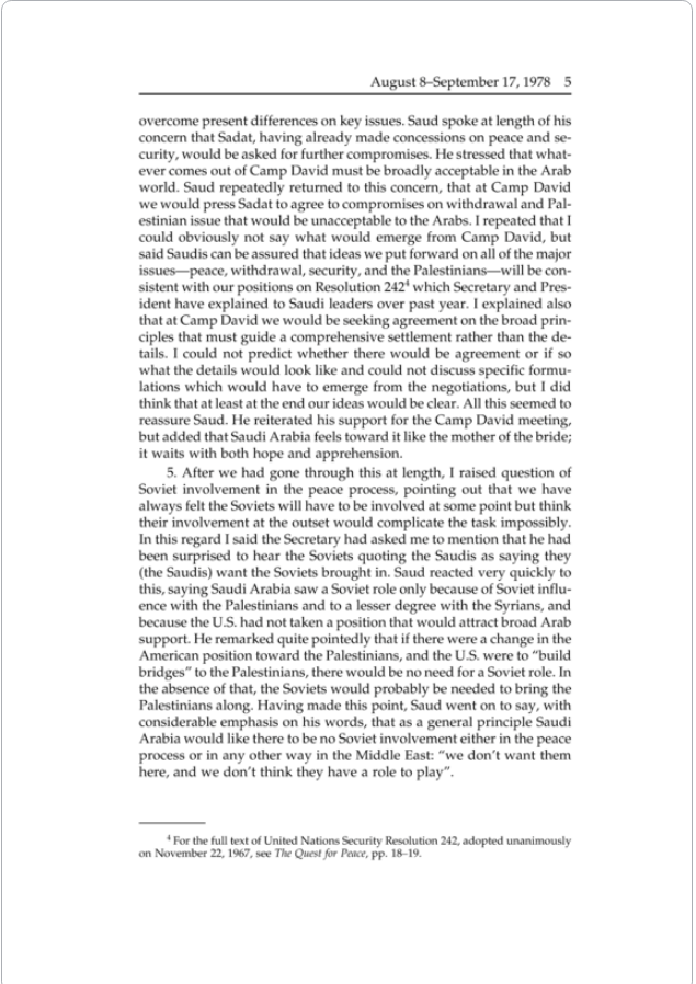 وقال مسؤول أمريكي كتب البرقية وشارك في الاجتماع ولم يكشف عن هويته، إن الأمير سعود "أعرب عن دعمه الكامل" لدعوة الرئيس الأمريكي، جيمي كارتر، لنظيره المصري أنور السادات، ورئيس الوزراء الإسرائيلي، مناحم بيغين، لعقد اجتماع في كامب ديفيد، و"صرح بأنه يفكر في توصية اللجنة الاستشارية العامة بإصدار بيان علني حول هذا التأييد".